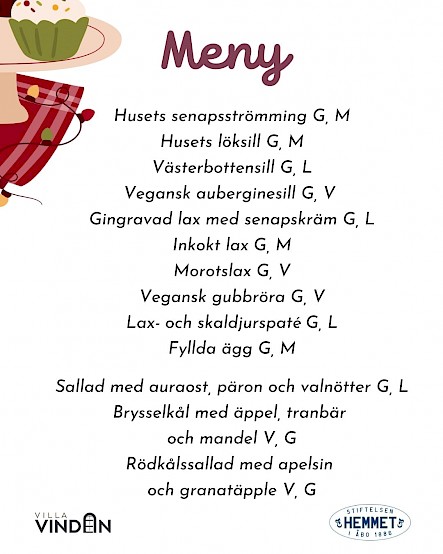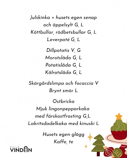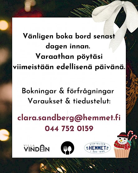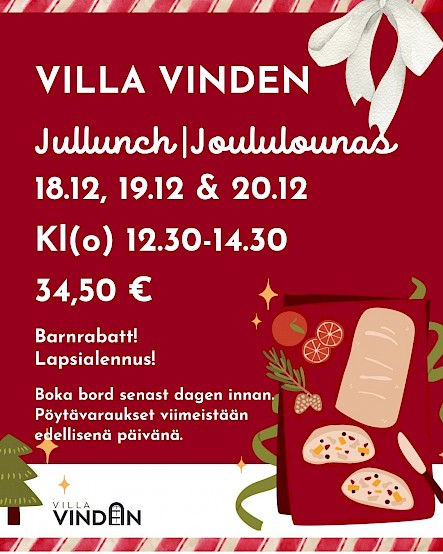 I år ordnas Villa Vindens omåttligt populära julluncher tre dagar: torsdagen 18.12 (fulbokad), fredagen 19.12 och lördagen 20.12 kl. 12.30-14.30.