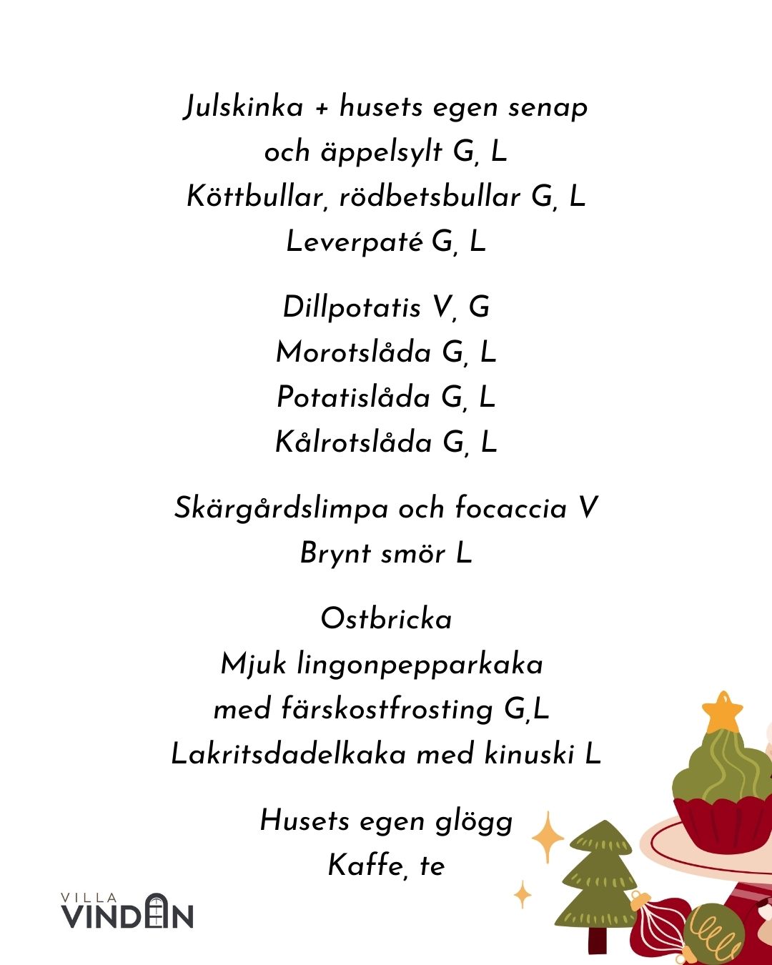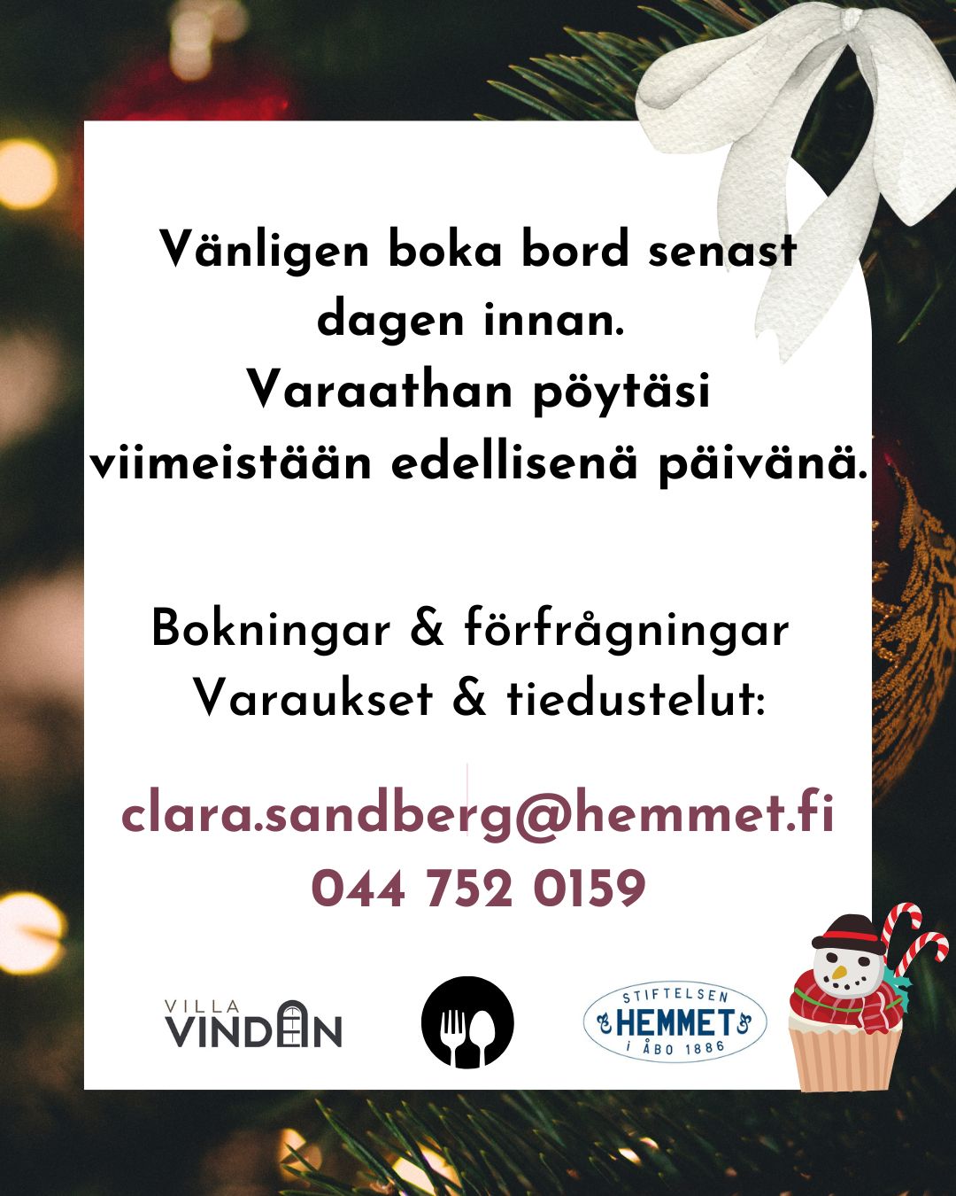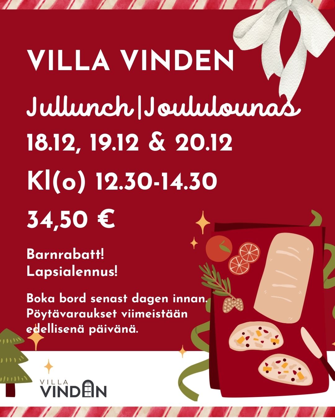 I år ordnas Villa Vindens omåttligt populära julluncher tre dagar: torsdagen 18.12 (fulbokad), fredagen 19.12 och lördagen 20.12 kl. 12.30-14.30.