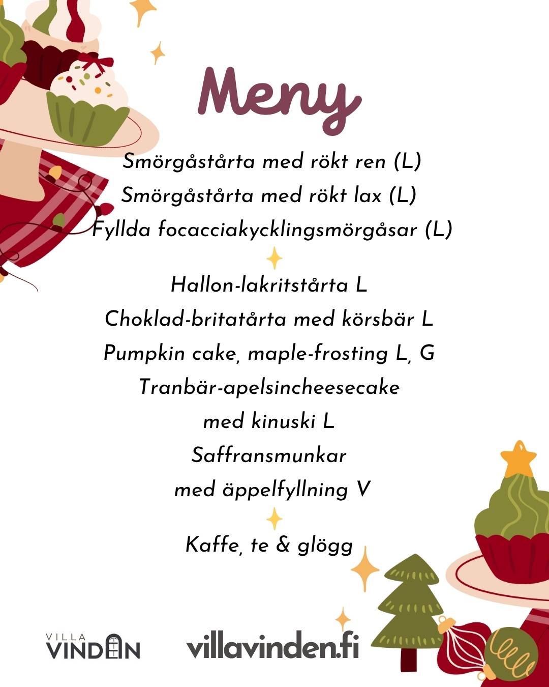 Lördagen 29 november dukas en dignande tårtbuffé upp på Villa Vinden. Hemmets kök bjuder på sina allra godaste bakverk, salt och sött! Boka plats för att fira lillajul eller bara annars njuta av livets goda! Drycker säljs också separat.