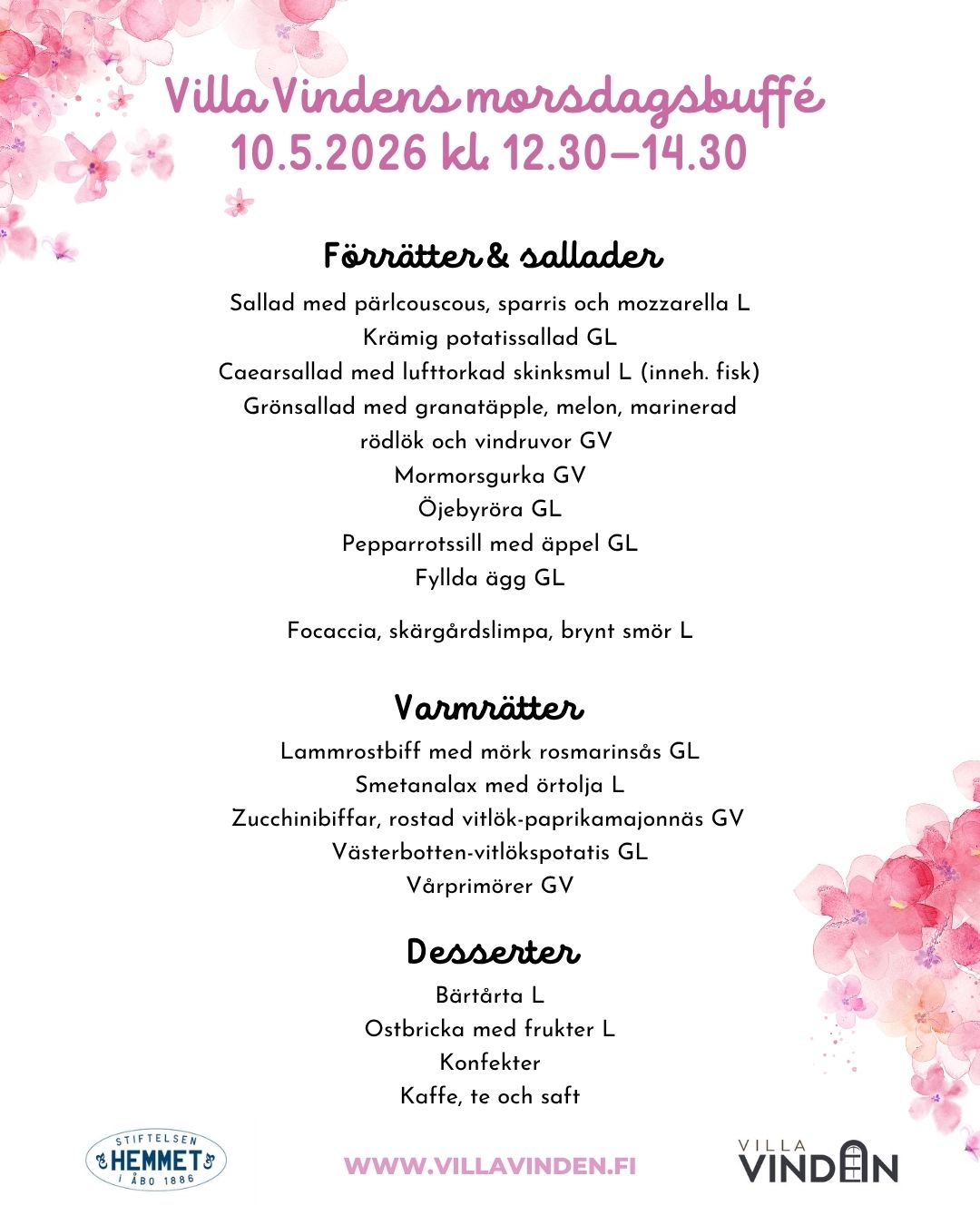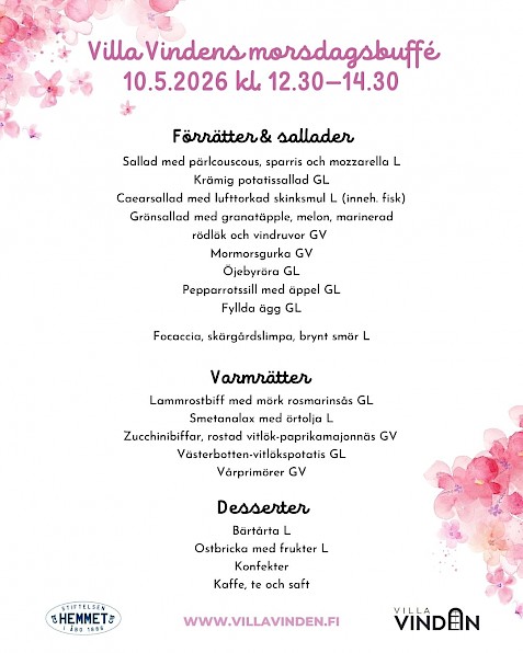 På Villa Vinden serveras högklassig mat tillredd med stort hjärta, helt från grunden och enligt säsong. Våren 2026 ordnas flera fantastiska bufféer för allmänheten. Villa Vinden har utskänkningsrättigheter och det finns olika drycker till försäljning, vid sidan av de drycker som ingår i bufféerna. Vi erbjuder god mat, personlig betjäning och familjär stämning, välkommen!