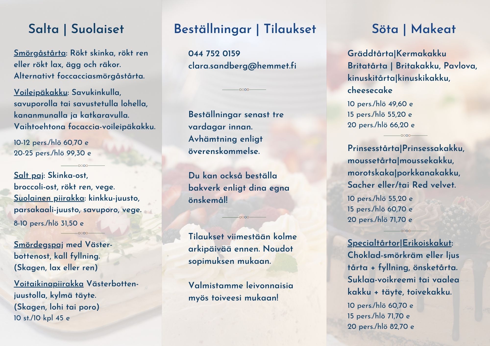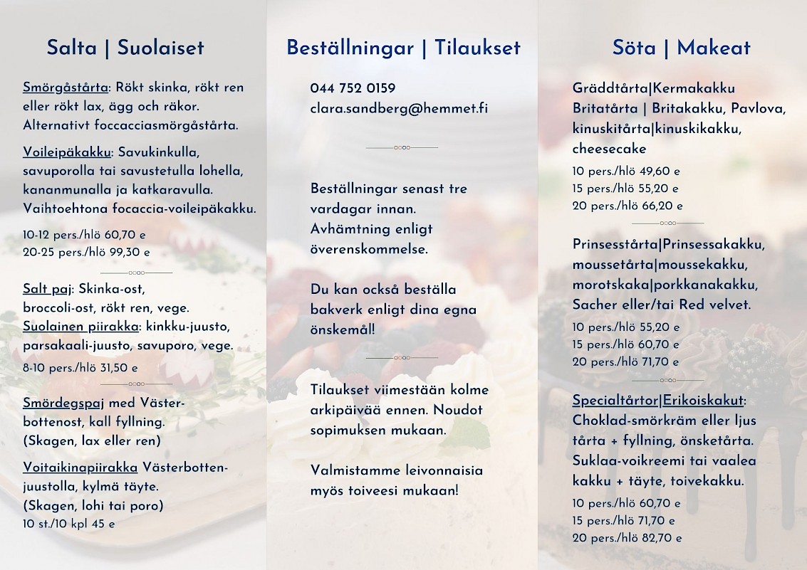 Vi ordnar både salt och sött till dopet, födelsedagskalaset eller studenthippan! Tårtorna som bakas i vårt kök är läckra och vackra att titta på, och kan beställas både till festen på Vinden och för avhämtning ifall du ordnar festen hemma hos dig. Du hittar våra vanligaste bakverk i broschyren nedan, klicka på bilderna och läs mer! Vi bakar också enligt önskemål och med beaktande av specialdieter.
